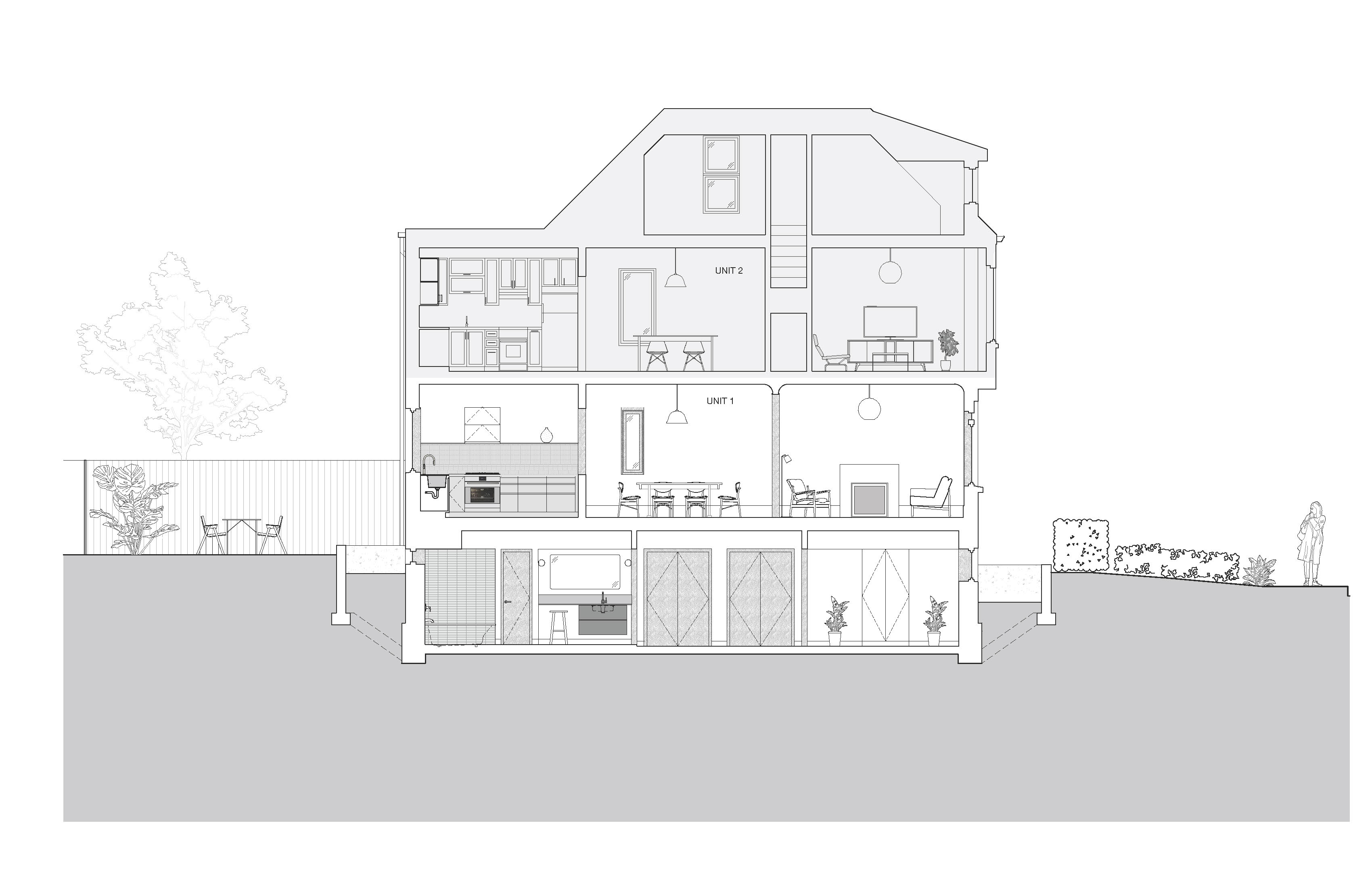 This project is a renovation of an existing 2-unit semi-detached home near Toronto’s Trinity Bellwoods Park. The focus is predominately on the lower unit for the homeowner’s own use, reserving the upper unit as a rental. Lightwells will be carved from the front and rear yards, bringing daylight down to the new floor level of the underpinned basement. In the rear yard, an existing single storey extension will be removed to create a more generous outdoor seating area. Each façade will be reclad and reinsulated, with a lime slurry applied over the existing brick areas to allow moisture to properly move through the wall. The mechanical system will upgraded to an energy efficient heat pump. The front façade is an architecture of collage, harmonizing an existing wood Tuscan column and existing oriel window with a new porch, new stairs and wood screens. For the interiors, the goal is similarly to bring coherence between old elements from the home (intricate patterned hardwood floors, cove ceilings), the client’s own highly curated and excellent mid 20th modern furnishings, and new natural materials and contemporary flourishes.