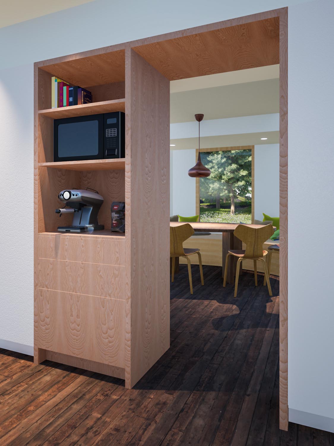 In 2024 JC-A completed a small faculty lounge renovation at the University of Toronto Mississauga (UTM) campus for the Department of Chemical & Physical Sciences located in the William G. Davis Building of 1973. The Davis Building is a landmark complex designed by the architect Raymond Moriyama in what we generally refer to now as the brutalist style. Our work involved adding a new ceiling, kitchenette and wall finishes to this interior space. The colour scheme of the walls, furnishings and dark walnut came out of a dialogue with the Department Chair. We harmonized the design requests for the lounge with a minimal ceiling pattern to align with both the historic precast concrete window frame and the new kitchenette. We added a terrazzo counter and backsplash with dark aggregate stones, a black sink, faucet, cabinet pulls and receptacles to harmonize with the glossy black appliances.
